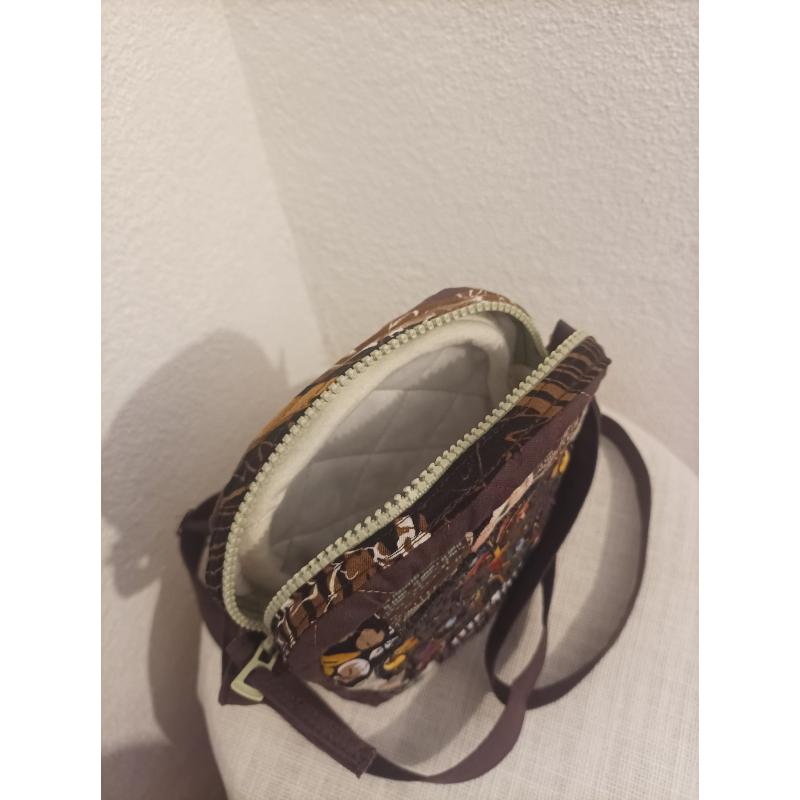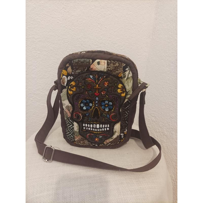 Sacoche matelassée patchwork marron avec applique brodée tête de mort bandoulière réglable :